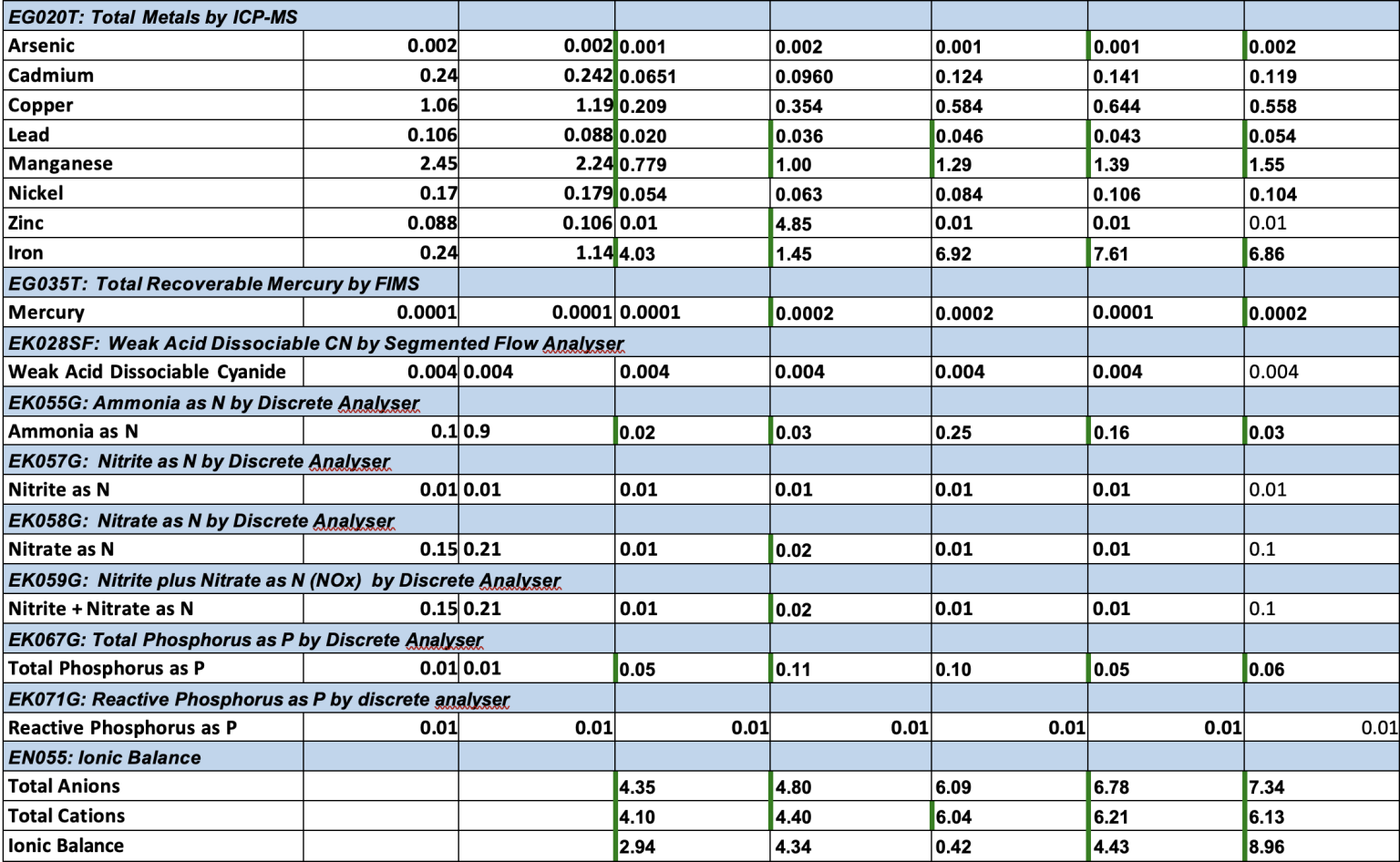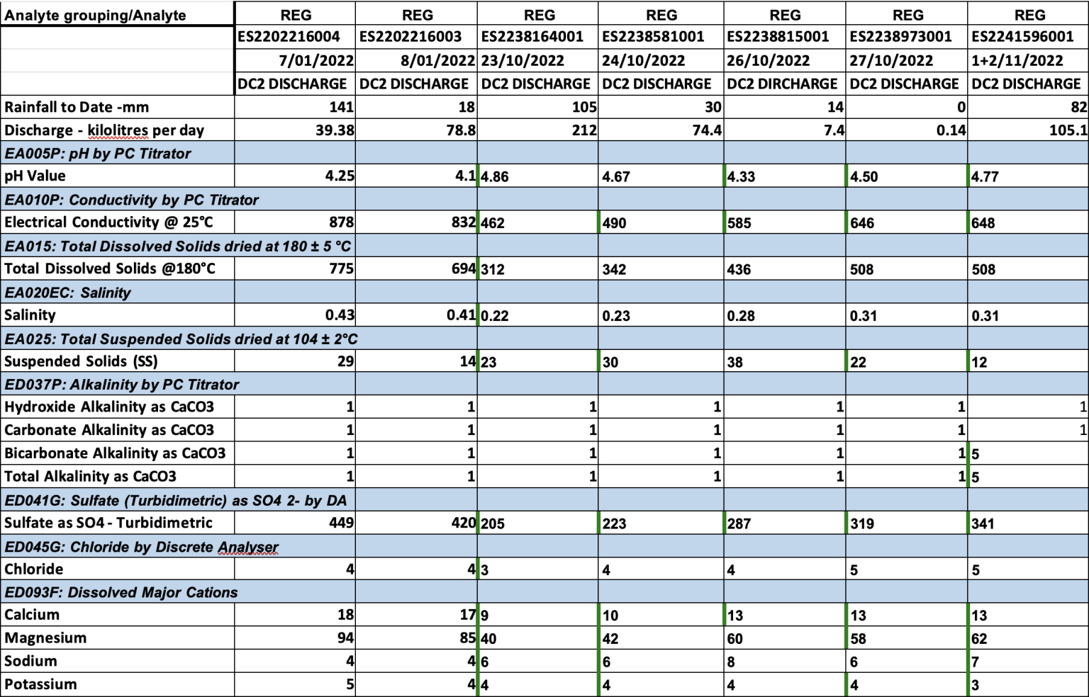 Reported discharge in quantity and quality from samples collected, with analysis being undertaken by ALS.